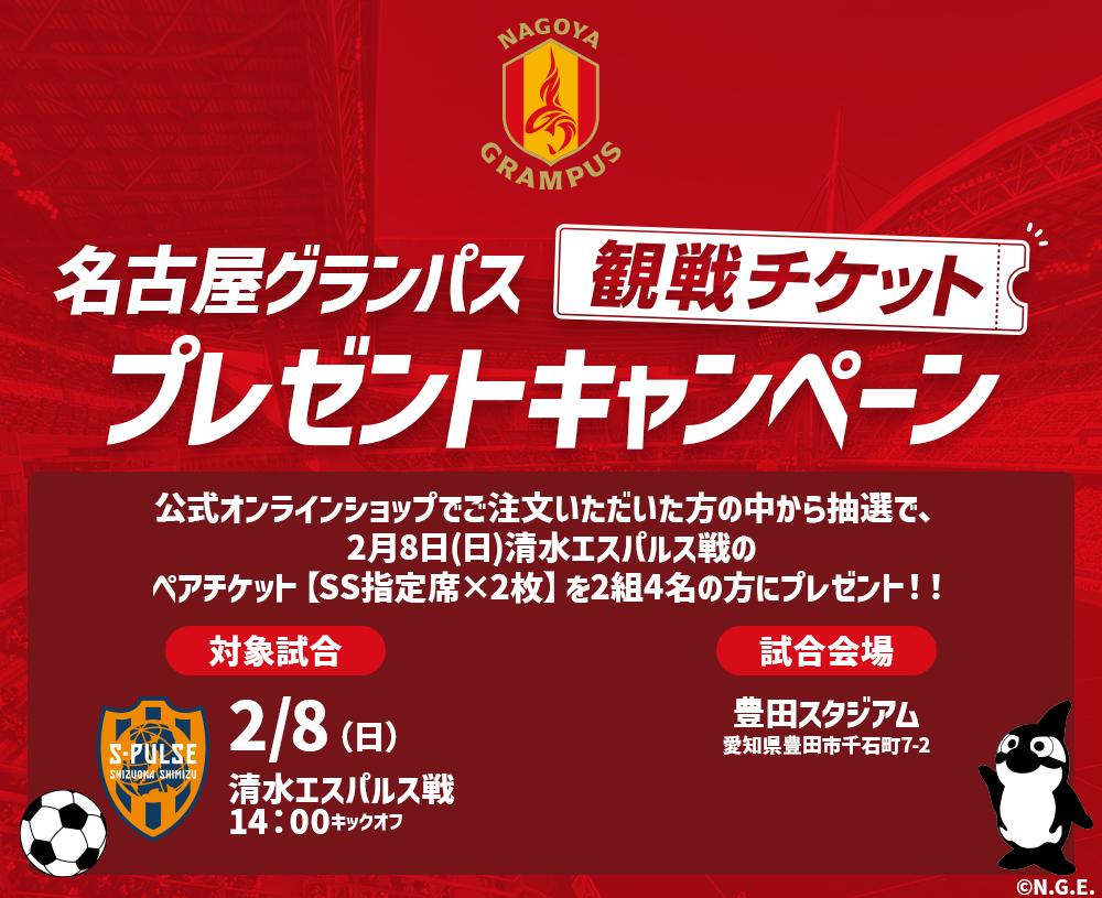 抽選で2組4名様に名古屋グランパスのホーム戦SS席ペアチケットをプレゼントいたします。