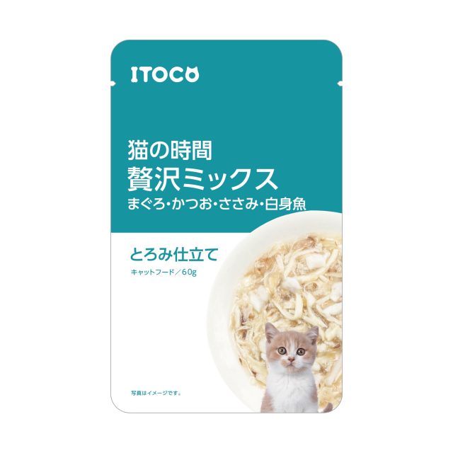 魚介類(まぐろ、たら、かつお、魚卵など)、肉類(鶏ささみ)、増粘安定剤(加工デンプン、キサンタンガム)、かつお節エキス、ミネラル類(塩化ナトリウム)、茶ポリフェノール、ビタミン類(A、B2、B3、B5、D3、E)