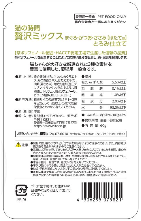 魚介類(まぐろ、かつお、まぐろエキス、かつお節エキス、ほたてエキス)、肉類(鶏ささみ)、増粘安定剤(加工デンプン、キサンタンガム)、ミネラル類(塩化ナトリウム)、茶ポリフェノール、ビタミン類(A、B2、B3、B5、D3、E)