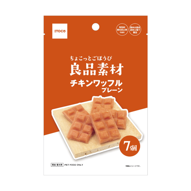 鶏肉の中でも低脂肪なササミを、千切りやすくて与えやすい形のワッフル風に仕立てたワンちゃん用のスナックです。