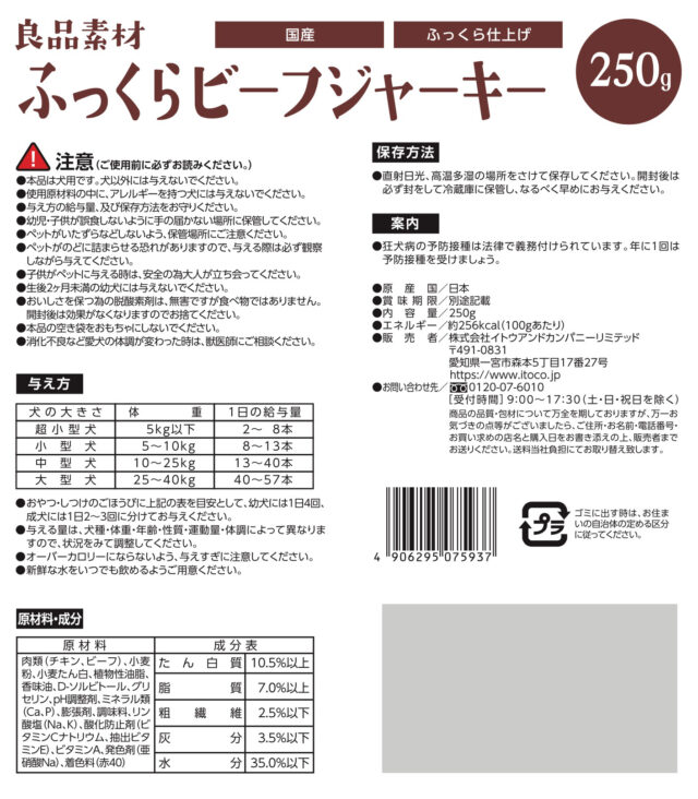 小型犬や高齢犬でも食べやすい、国産ふっくら仕上げのビーフジャーキーです。