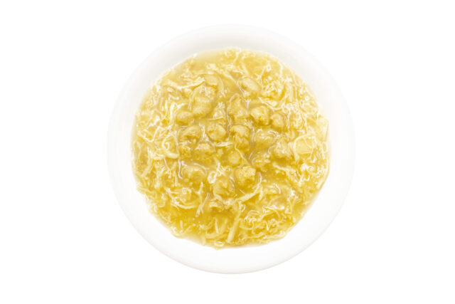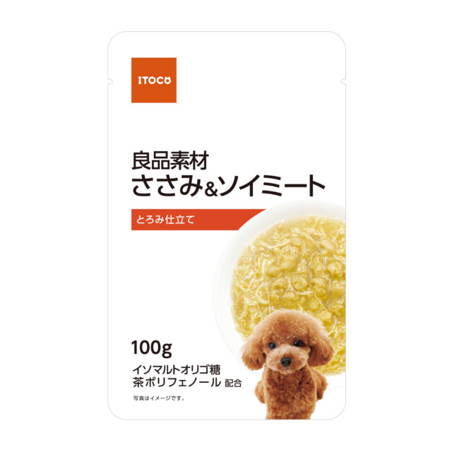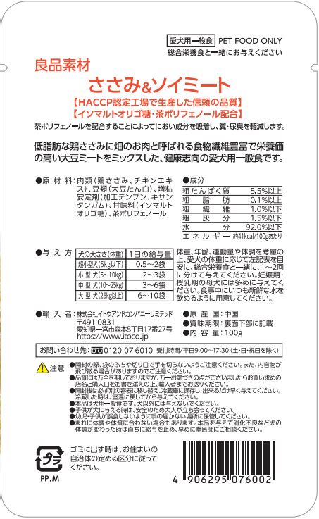 肉類(鶏ささみ、チキンエキス)、豆類(大豆たん白)、増粘安定剤(加工デンプン、キサンタンガム)、甘味料(イソマルトオリゴ糖)、茶ポリフェノール