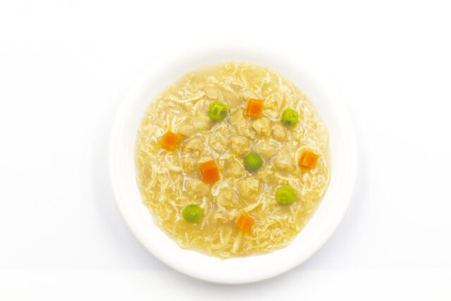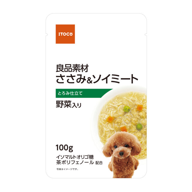 肉類(鶏ささみ、チキンエキス)、野菜類(にんじん、グリーンピース)、豆類(大豆たん白)、増粘安定剤(加工デンプン、キサンタンガム)、甘味料(イソマルトオリゴ糖)、茶ポリフェノール