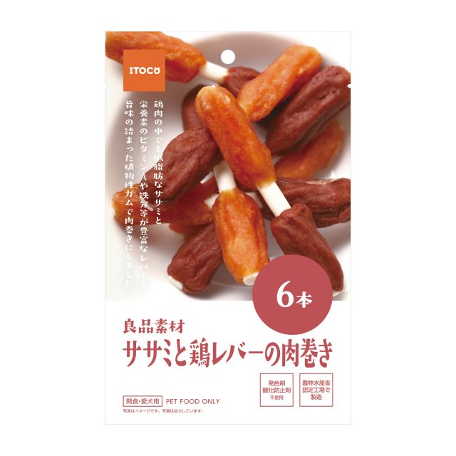 鶏肉の中でも低脂肪なササミと栄養素のビタミンAや鉄分等が豊富なレバーを旨味の詰まった植物性ガムで肉巻きにしました。