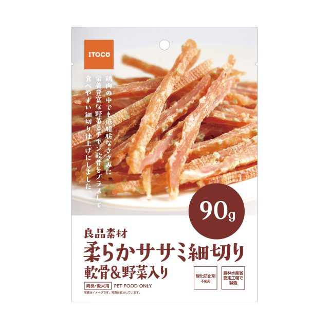 鶏肉の中でも低脂肪なささみに栄養豊富な野菜とチキン軟骨をプラスして、細きり仕上げにしました。