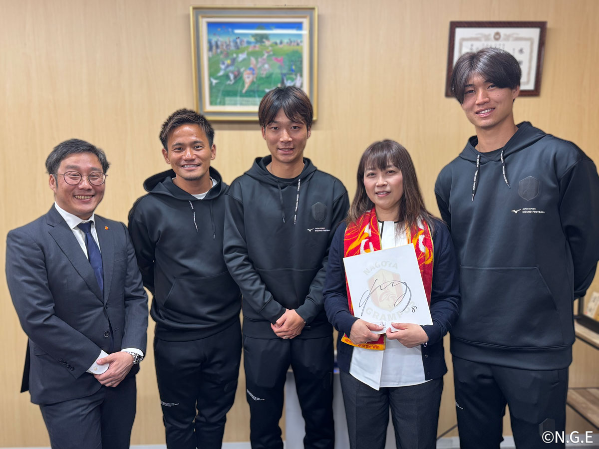 2025年12月9日、名古屋グランパスの清水克洋社長をはじめ、椎橋慧也選手、藤井陽也選手、徳元悠平選手の皆さまが、当社本社オフィスを訪問されました。